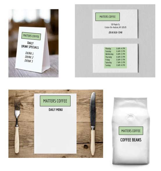 I created a Business Identity System for Matters Coffee, the coffee shop I previously created a brand plan for. I used the Economica type family that I selected last week when designing the shop’s logo. I used different fonts to create visuals for ways the brand can use their selected type family throughout their brand materials. This included the full menu, drink specials, a business card, and their coffee beans.