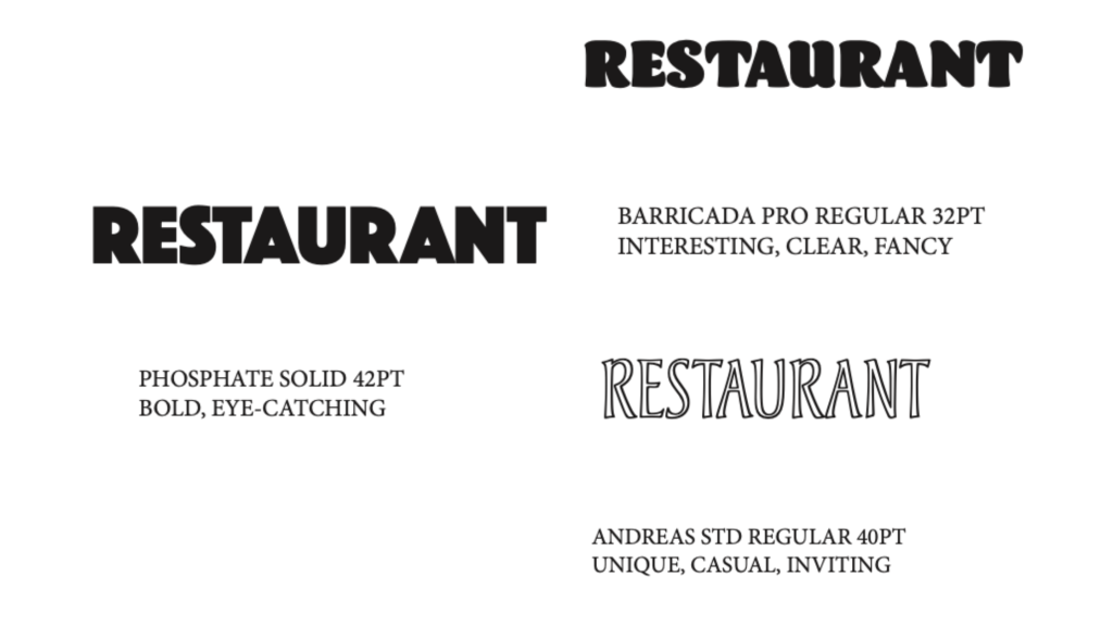 “Restaurant” is one of the nouns I chose to work with. As shown in the image above, there are a lot of different directions you can go with this. I described the Phosphate Solid font as “bold” and “eye-catching”. This is one I imagine could be used for a diner on the side of a highway. It’s classic and easy to read, something that a driver could notice and pull over to. The Barricada Pro Regular is one I would use for a restaurant on the fancier side. The serifs remind me of an upscale Italian or Mexican restaurant. Lastly, the Andreas STD Regular is one I associate with a more casual place, such as a pizza shop. It’s also important to note that in this project I often used “clear” as a descriptor for my fonts. This is because it is a necessary trait for logos to be legible.