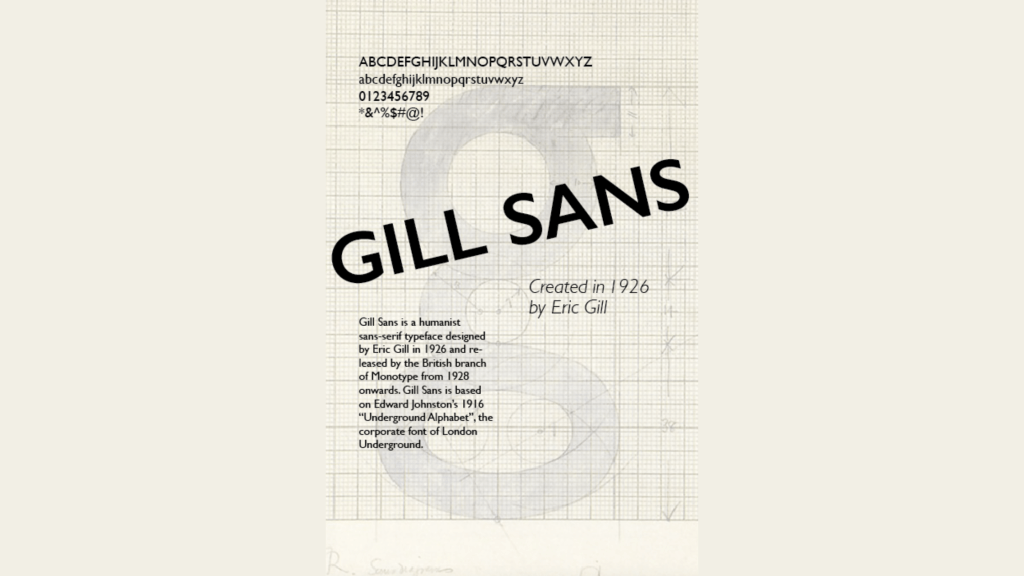 Gill Sans is a typeface I’ve noticed a lot throughout my life in passing, mostly because it has my name in the title. I decided to use the Gill Sans type family in a type specimen poster. This project is helpful to showcase a type family and its history.