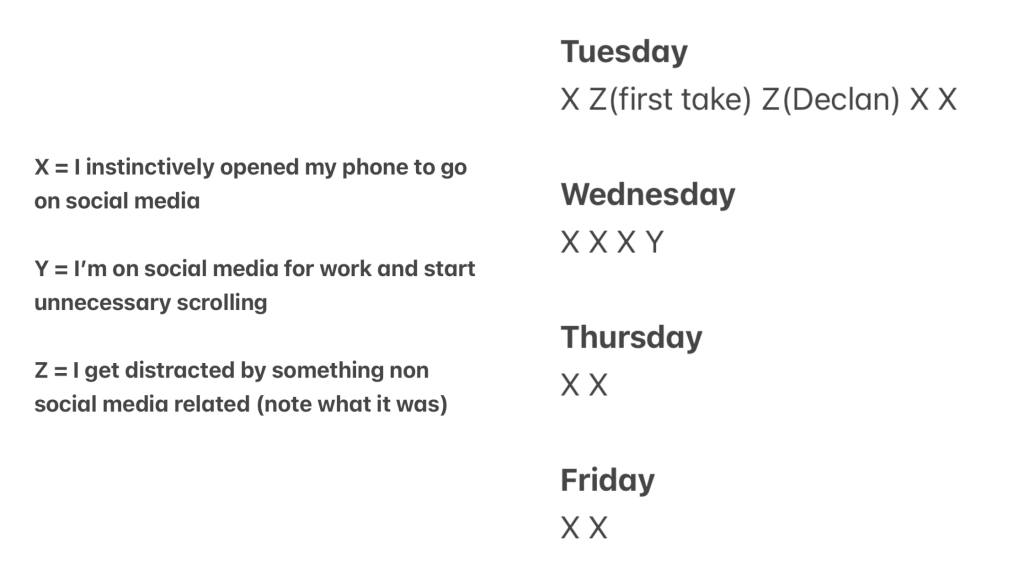 I am a part-time Social Media Manager and a part-time student. My current schedule is work from 9-12:45 and then I dedicate 1-5 for schoolwork. This keeps me on the 9-5 working schedule even while in school. With two big responsibilities, the time I spend working is valuable, but, I find myself often distracted by social media. Partly because social media is addicting, and partly because I use it for work and sometimes get stuck scrolling when I open it for work-related purposes. I challenged myself to give up all non-work related social media during the hours of 9-5, excluding the 15-minute break I allow myself from 12:45-1. This is ideally how I’d want to be moving forward and this experiment was a great way to practice. I also wanted to see how much I was distracted by anything that’s not social media. I’m pretty sure that social media is my main distraction, but I wanted to see if that were true or if there are other things I should keep in mind.