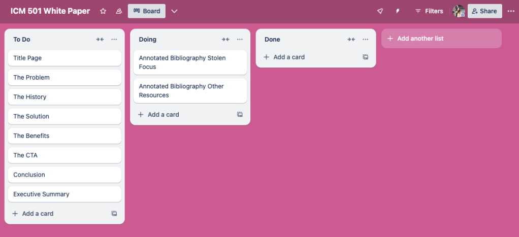 The screenshot above shows how I set up my Trello, to get organized for my upcoming White Paper. Trello allows you to create boards and within each board, you can create lists and in each list, you can add cards. Each card is a task that needs to be completed. I like to keep my lists simple, so I have three titled “To Do,” “Doing,” and “Done.” There is a lot to do to complete my White Paper, so I figured it was best to make each task an individual section of the paper. I’ve been working on gathering my research, both from the book Stolen Focus by Johann Hari and other resources. Once I have all my research in an annotated bibliography, I can start working section by section. I like this list format because I can focus on the “Doing” section without getting overwhelmed by the “To Do” section. Once a task is complete, I’ll move it to “Done,” and then move whatever I’m going to work on next to “Doing.” This organization will allow me to stay on track when completing my White Paper.