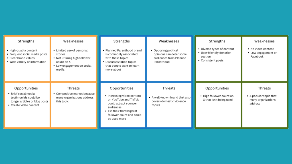 A competitive analysis is a crucial first step when evaluating what steps a brand should take to improve its content. In a HubSpot article about competitive analysis, Christine White explains that a competitive analysis report helps one to “understand the brand’s position in the market, map competitors’ strengths/weaknesses, and discover growth opportunities.” White defines competitive analysis as “the process of comparing your competitors against your brand to understand their core differentiators, strengths, and weaknesses. It’s an in-depth breakdown of each competitor’s market position, sales & marketing tactics, growth strategy, and other business-critical aspects to see what they’re doing right and find opportunities for your business.” I recently completed a content analysis report for the nonprofit organization, Women Against Abuse. Now, I’m taking a look at their competitors.