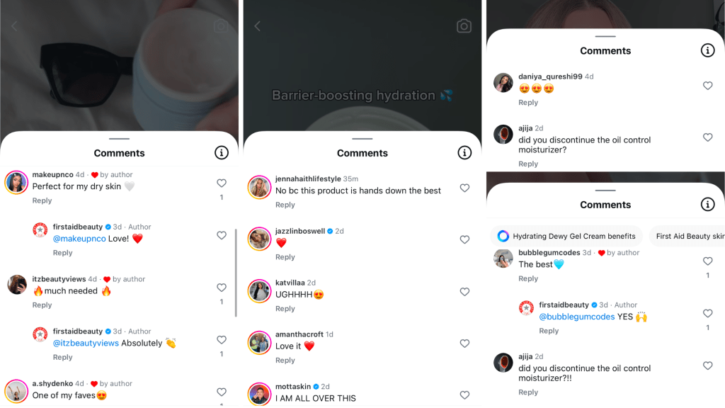Speaking of community, the one First Aid Beauty has built is entirely positive. All of the comments I read on their posts were positive and praised the products. My one critique here is on a couple of recent posts, the same user left a comment asking if a product was discontinued and they didn’t get a response. I would advise First Aid Beauty to stay on top of monitoring these types of comments because it shows they care about their customers and if one person is asking then it’s likely that other people have the same question.