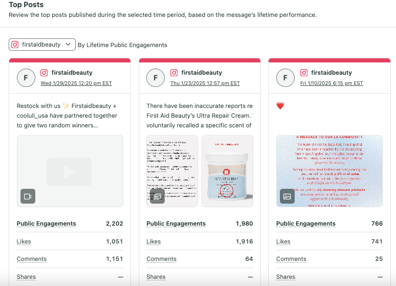 Finally, the last suggestion I would make to First Aid Beauty is to include popular topics within the content. As I mentioned earlier, their post about the LA wildfires is one of the highest-performing posts from the past year. I would consider including content related to something that a lot of people are talking about, whether it’s a tragedy like the fires or perhaps something more uplifting like awards season. A “get ready with me” for an upcoming award show using a First Aid Beauty product would do really well, bonus points if they can get a celebrity to film it.
