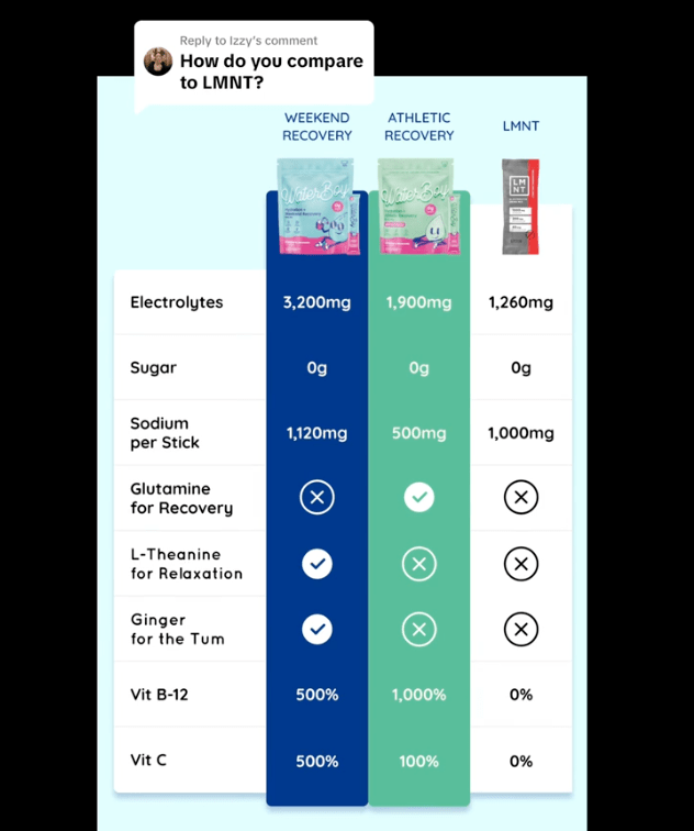 The format of the ad is a video response to a comment. This immediately stood out to me because video responses are a popular video style on TikTok, often used by creators. I like how this format helps the video feel less like an ad. Within the video, you can see the comment which asks, “How do you compare to LMNT?” Below the comment is a graphic with a side-by-side comparison of Waterboy’s Weekend Recovery, Waterboy’s Athletic Recovery, and LMNT’s Electrolyte drink mix. This graphic clearly shows why Waterboy’s product is better than its competitors. It also highlights the differences between Waterboy’s two products, showing how they’re both better than LMNT, but they have different strengths depending on your needs. The ad links to a landing page where you can purchase Waterboy’s Weekend Recovery.
